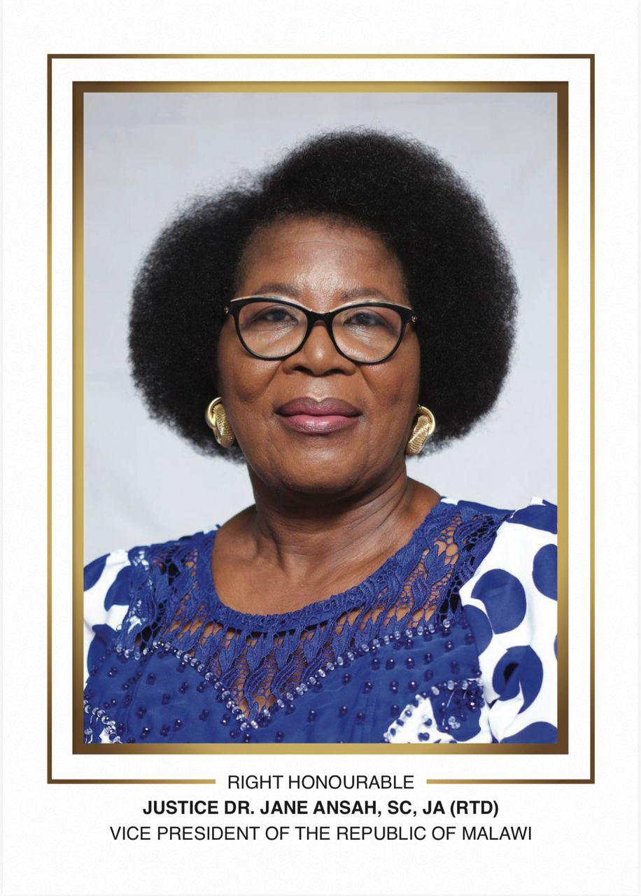 Right Honourable Justice Dr. Jane Mayemu Ansah, SC, JA (Rtd) - Vice President of the Republic of Malawi. Dr. Jane Mayemu Ansah, SC, JA (Rtd) (née Mjojo) is a distinguished legal scholar, public servant, and faith leader whose career spans over four decades of transformative leadership. Born on 11th October 1955 in Njolomole Village, Ntcheu District, she is a proud Ngoni woman and Impi to Inkosi ya Makosi Gomani the Fifth.